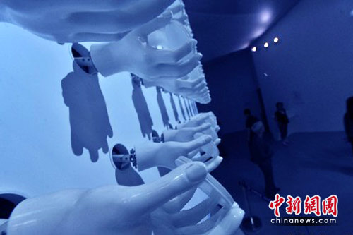 5月的上海世博园生命阳光馆里,一尊名为《一百只手》的智能雕塑吸引众人观赏,该雕塑赞美人的肢体感知于镜面,投影组合成“运动”的汉字。这座残疾人主题馆,是世博会159年历史上首次设立。中新社发 贾国荣 摄