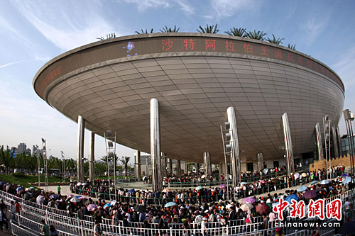 5月11日,上海世博会中造价最高的沙特馆成为最热闹的地方,排队等候时间一度超过4个小时。沙特馆13亿元的造价,是世博园区最贵展馆,是沙特参加世博会有史以来规模最大的一次。中新社发 杜洋 摄