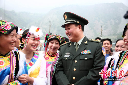 5月12日,济南铁军三位军官重回汶川银杏乡参加“5.12”汶川地震两周年纪念活动,银杏乡百姓自发组织向铁军赠送“羌绣”、“红鸡蛋”表示感谢。据了解,“5.12“地震发生后,铁军第一批来到银杏参加救援,在这个曾一度被称为“死亡之谷”的地方,铁军不顾身危,顽强地在银杏乡战斗数十日。中新社发 张浪 摄