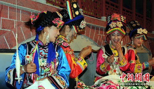 5月12日,四川汶川特大地震两周年,来自四川茂县的7位在当地被称为“西羌之花”的羌族姑娘亮相上海世博会四川馆,现场表演少数民族舞蹈及羌族刺绣,以此“感恩”世界。中新社发 张冬冬 摄