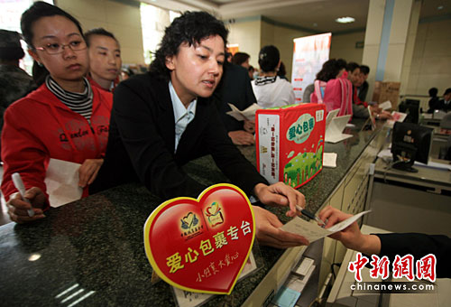 5月12日,新疆乌鲁木齐市扬子江路邮局,市民捐购“爱心包裹”,为汶川、玉树地震灾区及贫困地区儿童提前寄去六一儿童节礼物。“爱心包裹”项目由中国扶贫基金会组织发起,通过一对一捐助模式,为贫困地区及灾区(汶川、玉树等)儿童送文具、送礼物、送关爱,帮助贫困地区及灾区儿童(学生)快乐健康成长。中新社发 刘新 摄