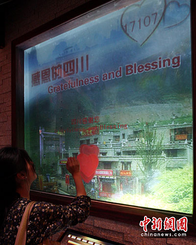 5月12日,是“5·12”四川汶川特大地震两周年。在上海世博四川馆内特设的“感恩墙”吸引众多游客伸出“援手”。当参观者将手贴在“墙”上,电子屏幕上将显示一串红心,表示对“向四川伸出援手的方方面面表示感谢”,目前“感恩墙”上已留下将近2万个掌印记录。中新社发 汤彦俊 摄