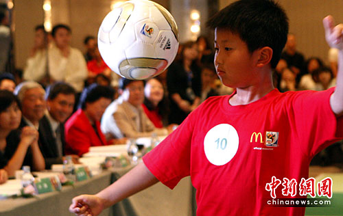 5月12日,“2010南非世界杯球童选拔”活动在北京举行决赛,四名小朋友凭借出色表现获得2010年南非世界杯球童资格,他们将与另外两名来自四川平武县地震灾区的儿童踏上南非之旅,作为球童与参赛球员牵手步入世界杯赛场。图为小球童在决赛上展示球技。中新社发 钱兴强 摄