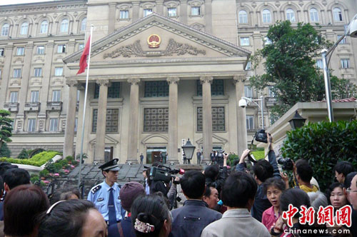 5月13日,文强案二审开审,图为开审前市民和媒体在重庆市高级人民法院门口聚集。杜远 摄
