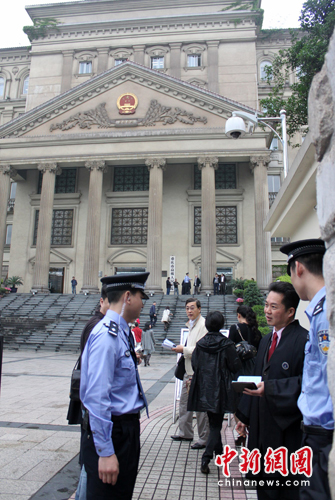 5月13日,文强案二审在重庆市高级人民法院开庭。文强辩护律师杨矿生(右二)进入法庭,在庭上称认为一审对文强量刑过重。 郭虹 摄