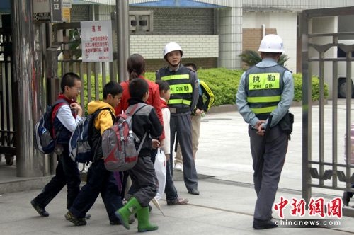 5月13日,福州一所小学的学生走进有保安把守的校门口。从福建省教育部门了解到,目前福建全省1万6千多所中小学校、幼儿园已全部配备保安员,共配备保安员21900多名。中新社发 王东明 摄