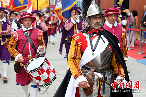 5月13日,上海世博各国展馆揽客出奇招 ,来自马耳他的“古代骑士”列队巡游世博园吸引了众多游人。中新社发 汤彦俊 摄