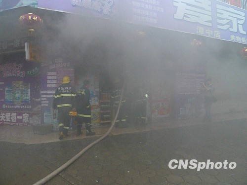 5月14日清晨,广西柳州市高新南路一家超市突发火灾。接到火警调度后,柳州特勤消防大队迅速赶赴现场扑救,火灾未造成人员伤亡。中新社发 罗海生 摄