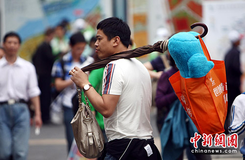 5月16日,上海世博园里一名游客用雨伞当扁担,前挑女士坤包、后挑世博吉祥物“海宝”。适逢周末,雨后的上海天气凉爽,吸引了大批游客前来游玩。中新社发 杜洋 摄
