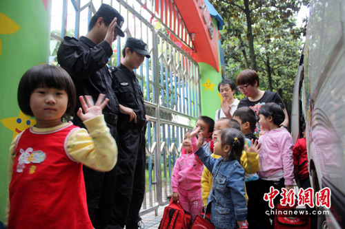 5月17日上午,湖南长沙岳麓区教育局幼儿园门口,上幼儿园的小朋友向特警挥手问好。近日,长沙中小学校和幼儿园的校园安保步步升级。长沙警方荷枪实弹为学生“护驾”,并投入总价值达40余万元人民币的警用安全防护装备,保护该市所有中小学和幼儿园。