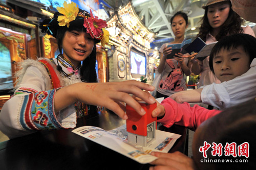5月的上海世博会中国省区市联合馆,堪称大陆南北佳丽大荟萃。图为云南阿诗玛礼仪小姐为参观者们的世博护照加盖纪念印章。中新社发 贾国荣 摄