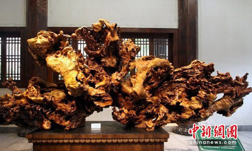 近日,在浙江开化县的“中国根艺美术博览园”内,自然枯烂死亡的古树根,在根雕师傅的妙手之下重获生机,化身为神态各异的罗汉。开化县作为“根雕佛国”渐成气候。图为大型根雕“灵山护法”,上面次第雕刻着形态各异的十八罗汉。中新社发 赵晔娇 摄