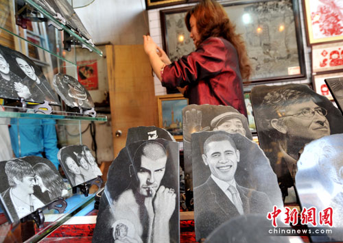 5月的上海街头,一家石板影雕商摊上摆着以总统奥巴马为首的世界名人肖像艺术品,非常醒目。华裔美国商务部长骆家辉率领的奥巴马总统上任后首个内阁级贸易访华代表团,18日将展开上海世博会之行。中新社发 贾国荣 摄