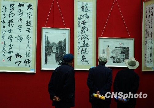 5月17日,“中国书画名家走进沛县采风暨作品展”在江苏沛县图书馆开展。本次书画展由中国沛县第八届刘邦文化节组委会主办、汇聚了程大利、赵绪成、袁武、吴山明、言恭达等中国当代书画艺术名家的60余件作品,参展作品体裁丰富,形式多样。 中新社发 杨慧峰 摄