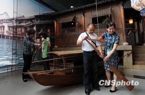近日,2010年上海世博乌镇展厅别出心裁,将百年前的历史文物和遗产搬进充满时代气息的世博园中。图为观众现场学摇橹。中新社发 沈兰 摄