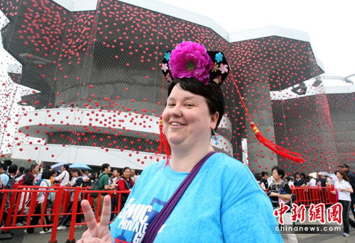 5月18日,一位外国游客头戴中国清宫头饰在上海世博园内感受中国魅力享受快乐世博。中新社发 汤彦俊 摄