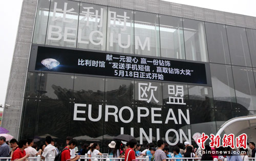5月18日,为吸引更多的游客,世博比利时馆宣布推出“发送手机短信 赢取钻饰大奖”活动,每天抽取一位幸运儿获得比利时馆送出的价值4999元人民币的钻饰。 中新社发 汤彦俊 摄