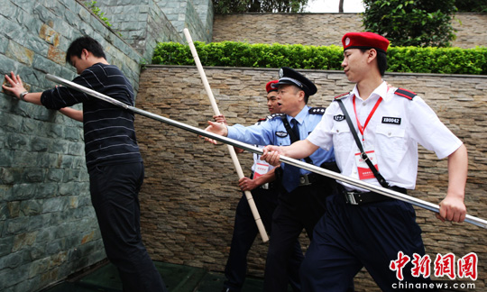 5月18日,重庆沙坪坝区一中学内,驻校校警指导该校校园保安用木棍和钢叉抵挡围困“凶徒”。5月3日,重庆沙坪坝区公安分局在该市率先组建校园安全保卫支队,向学校派驻“校园民警”。目前,重庆市42个公安分局、区县局已全部组建校园安全保卫支(大)队,配备民警373人,第一批校园民警已正式到岗到位,组织带领学校保卫干部、保安人员开展校园安全保卫工作。中新社发 郭晋嘉 摄