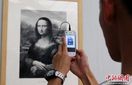 5月18日,《刻画田地——法国卢浮宫馆藏铜版画展》在重庆开展,吸引众多当地绘画、雕刻爱好者前去参观。据称,曾在港、澳、台地区巡回展出并广受好评的《刻画田地——法国卢浮宫馆藏铜版画展》此次在渝展出是其在中国大陆地区巡展的首站。本次展出的94组展品精选自法国卢浮宫博物馆馆藏铜版珍品,并在卢浮宫铜版雕刻收藏馆工作坊中印制而成,内容涉及“柯洛内里天文仪”、“蒙娜丽莎”、“领导人民的自由女神”等。图为一市民用手机拍摄蒙娜丽莎铜版画。中新社发 郭晋嘉 摄
