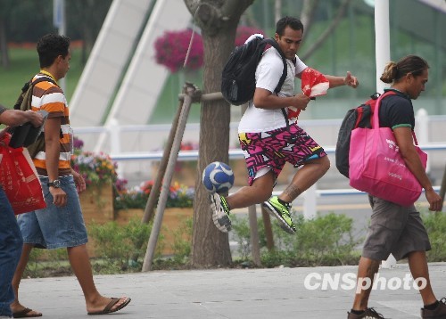 5月19日,一外国游客在上海世博园里大展球技。中新社发 杜洋 摄