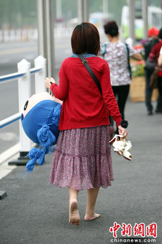 5月19日,一名女孩手拎高跟鞋走在上海世博园里。中新社发 杜洋 摄