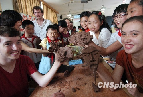 5月19日,来着美国的约翰(左一)和玛丽(右一)与小学生一起展示陶艺作品《夸张的脸》。当日,浙江工业大学的12名美国留学生来到杭州现代实验小学,参加“相约现代”涉外文化交流活动,中外学生一起制作陶艺《夸张的脸》,将中国传统的民族文化艺术赋予“中西合璧”的新涵义。中新社发 施健学 摄