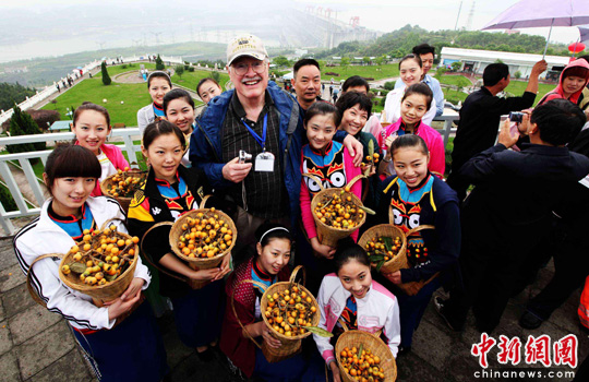 中新网宜昌5月19日电(郭晓莹 邓立中)三峡大坝旅游景区19日迎来首届枇杷节,在景区游览的中外游客品尝到了由坝区工作人员亲手种植并采摘的新鲜枇杷。