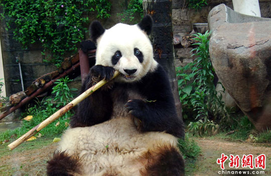5月20日,在世界生物多样性宣传月及宣传日到来之际,福州熊猫明星“巴斯”正开心得吃着竹笋。闻名中外的“巴斯”四岁那年在冰河中被救起,今年已经三十岁了。三十岁对于人类来说,正是青春勃发的年龄,而对平均寿命仅有十二、三岁的野生大熊猫来说,已经跨进了相当于人类“百岁”以上的门槛,全世界过三十岁的熊猫少之又少。福州熊猫世界将联合有关部门拍摄一部以“巴斯”为主线,反映两岸题材的大熊猫电影故事片。中新社发 张丽君 摄