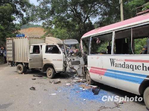 5月20日下午14时许,广西百色市平果县一中巴车与一小货车相撞,事故造成货车司机当场死亡,另有两人受伤。平果县消防中队官兵接到报警后,立即出动1辆抢险救援车及7名官兵赶赴现场,经过30分钟的紧急营救成功将被困人员成功救出。中新社发 贺翔 摄