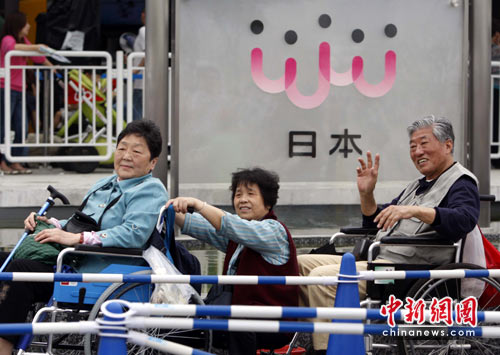 5月21日,一些老年人乘坐轮椅在上海世博会日本馆绿色通道前排起数十米长队,等待入馆。截至当日,世博会入园人数已超过430万。中新社发 张宇 摄