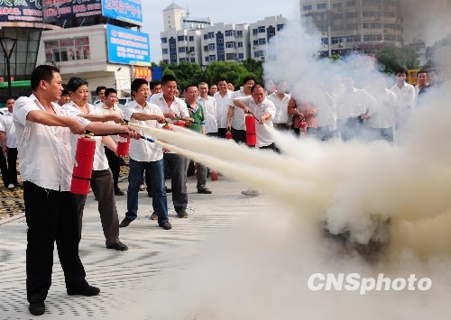 5月21日,针对入夏高温天气,避免“的士” 自燃事故,浙江省玉环玉汽出租公司组织120名“的哥”举办了消防安全培训。培训教授了火灾发生时如何报警、灭火扑救和疏散旅客等消防安全知识、技能培训,以提高出租车驾驶员的消防安全意识及临危应急处置能力。中新社发 林楚炳 摄