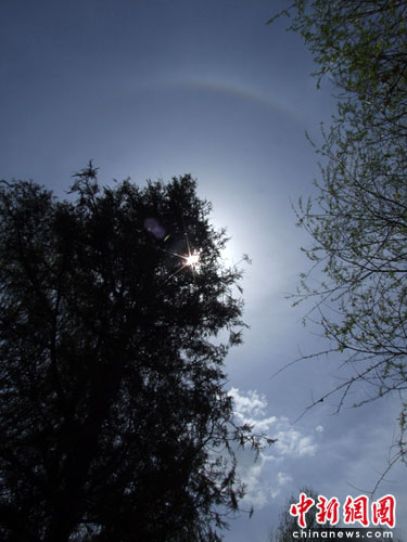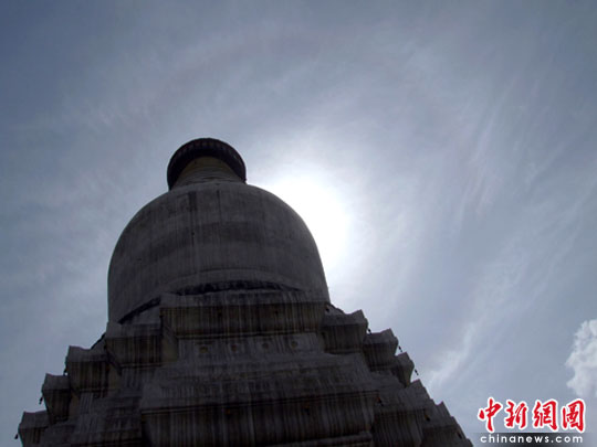 中新网5月23日电 (高峰毅 焦瑾琦) 近日,华北地区气温居高不下。5月21日晚9时许,山西五台山出现了月晕现象,持续了近一个小时。而第二天,即22日上午9时许,五台山上空又出现了日晕奇观,,并持续了两个多小时。这两种晕的出现时间差不足12小时,着实令人称奇。