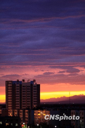 5月24日21时许,新疆库尔勒市天空出现火烧云景观。当日上午,库尔勒市迎来一场小雨,下午16时许结束。 中新社发 焦银辉 摄