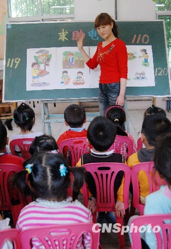 5月25日,安徽淮北矿业童亭矿幼儿园老师在教小朋友使用求助电话。为让小朋友们过一个平安、快乐的“六一”儿童节,童亭矿幼儿园教师自制知识卡片,自编安全歌谣,加强节日安全教育,提高孩子们的自防自救意识。 中新社发 陈磊 摄
