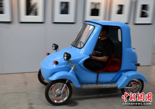 5月25日,一辆貌似未来汽车的“迷迷电动轿车”,奔驰在上海国际科学艺术展上,让许多记者惊奇。据了解,这是由上海汽车爱好者张海艇发明的,现已投入生产,并将以5千多元人民币的售价进入市场。据了解,该迷迷车充电一次,可行驶50公里,在上海马路上行驶时,曾获得过警察的称赞。 中新社发 潘索菲 摄
