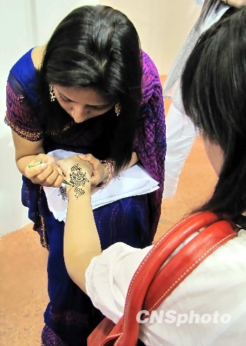 2010年5月25日,上海世博孟加拉馆,美丽的孟加拉姑娘坐在椅子上,给游客绘制暂时性纹身。这种叫“曼海蒂”的工艺是南亚以及中东常见的一种传统身体装饰。蜷曲缠绕的图形,或是花卉或是动物,象征着吉祥如意等各种含义。据了解,这种纹身用的染料是指甲花的枝叶捣碎后做成的,对皮肤无害。在孟加拉,“曼海蒂”传统上是作为嫁娶时祝福之用。中新社发 井韦 摄