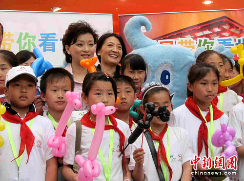 5月28日,世博会形象大使杨澜带领20名贫困地区的儿童参观上海世博会,在德国不来梅案例,一起观看童话剧《四个音乐家》,提前欢度六一儿童节。中新社发 陈婷婷 摄