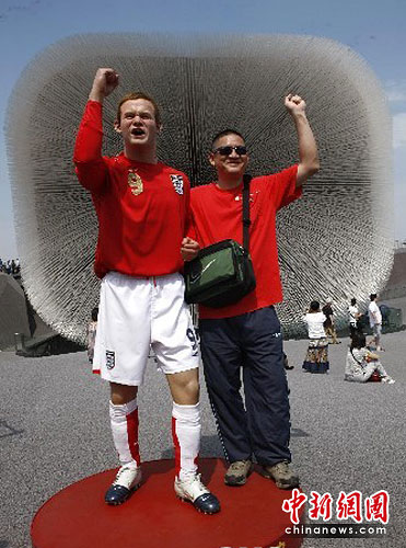 5月28日,素有“足球神童”之称的英国国脚鲁尼蜡像出现在热闹非凡的2010上海世博园英国馆门前,前来参观世博的游客大为惊喜,纷纷与栩栩如生的鲁尼蜡像合影。中新社发 李佳佳 摄