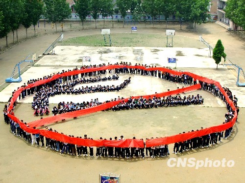 5月28日,河南省灵宝市阳平一中,500多名学生用废旧横幅拼成“禁止吸烟”的图案,倡导“无烟校园,低碳生活”的理念。中新社发 赵华 摄
