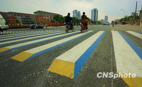 5月28日,行人从立体斑马线上通过。近日,市区解放路淮阴中学门前彩色“立体斑马线”吸引了很多市民的目光,这种由蓝白黄三色相间彩条组成的斑马线立体视觉效果明显,看上去像立起来的台阶, 给过往驾驶员强烈的视觉刺激,从而减少道口交通事故的发生。中新社发 陈忠军 摄