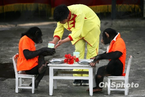 5月29日,在重庆永川野生动物园内,两只猩猩在表演小品。一直雄猩猩正在请他的“女朋友”吃饭,服务生在精心服务。雌猩猩欣然接受邀请,还把腿翘到桌子上,煞是可爱。中新社发 苏丹 摄