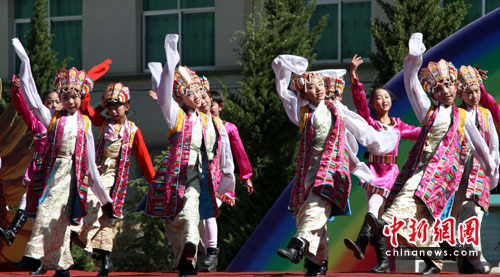 5月30日上午,西藏拉萨市师范附小孩子们在该校操场上举行“童声如歌 童心飞扬 ”文艺汇演,并举行少先队入队礼。孩子们载歌载舞、欢声笑语迎接自己的节日。中新社发 徐长安 摄