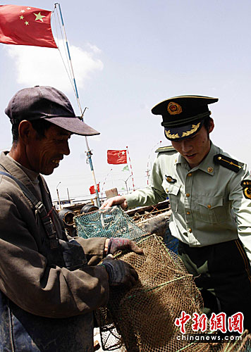6月1日12时至9月1日12时,中国北纬35度以北黄海、渤海海域将实施净海休渔,届时渔船收港、网具上岸,进入为期三个月的伏季休鱼期。休渔期间,除单层刺网(渤海单层流网的网目尺寸须90毫米以上)和钓钩外,禁止其他渔具在伏季休渔期间从事捕捞活动。公安边防部门将联合渔政等部门,按照“船进港、网入库、人上岸、证集中”的休渔要求,加强休渔期渔船民管理工作,维护伏季休渔秩序。图为唐山南堡边防派出所的民警在向渔船民宣传休渔期相关政策并帮助渔民将网具送上岸。