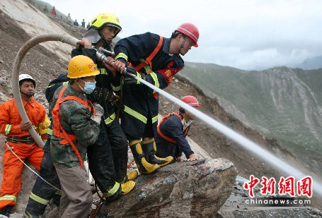 5月31日晚,经过48小时上百人的努力,国道213线汶川至茂县恢复双向通行。四川省委副书记李崇禧第二次来到汶川“震中生命线”抢险现场,亲自参与抢险。由雁门乡前往萝卜寨的便道也同时抢通。截至记者发稿为止,国道213线汶川段滞留车辆已基本通过垮塌路段。图为四川省委副书记李崇禧(左2)与消防官兵一起排险。中新社发 刘忠俊 摄