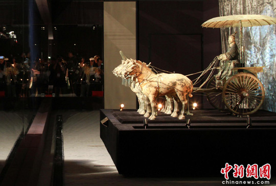 6月1日,秦始皇帝陵出土的“一号铜车马”亮相世博会中国国家馆,这是它出土30年以来第一次“驶出”陕西。这件国宝级文物于1980年出土,通体彩绘,为双轮,单辕,驷马系驾,总重约1061公斤。铜车马共由3500多个零件组成,除一些金、银饰件外,其余全部为青铜铸件。中新社发 殷春永 摄