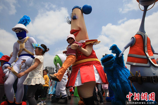 6月1日,来自上海世博会可口可乐等企业馆的数十个卡通明星集结在世博园区,与孩童共舞同乐。中新社发 潘索菲 摄