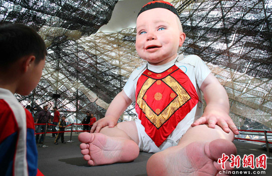 6月1日,上海世博会西班牙馆内的“小米宝宝”穿上了印有吉祥图案的中国式红肚兜喜迎儿童节,吸引了众多小朋友的目光。中新社发 汤彦俊 摄