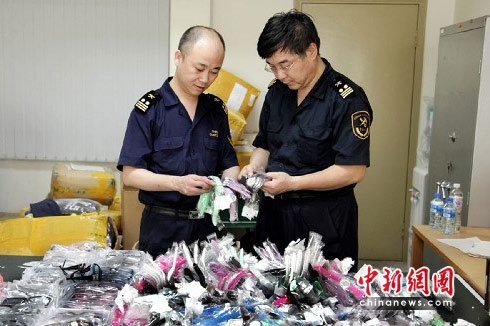 5月25日、26日两天时间,北京海关在邮递物品监管现场成功截获涉嫌侵权的名牌手表、手机、眼镜等物品近万件。中新社发 雷虹 摄