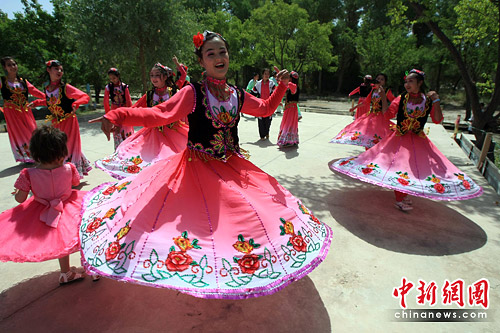 6月1日,新疆喀什地区泽普县中学70多名初一、初二年级的维吾尔族中学生身着民族盛装相聚在一起唱歌、跳舞,欢度六一儿童节。中新社发 刘新 摄