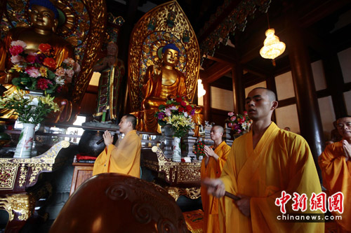 6月2日是青海玉树“4·14”强烈地震发生第49天,在中国佛教协会倡议下,三亚佛教协会在南山寺举行“七七”超荐祈福法会。三亚佛教协会会长、南山寺方丈新成大和尚带领全体僧众为玉树灾区同胞祈福追荐。据了解,青海玉树“4·14”地震后,三亚佛教界已向玉树灾区募捐57万元。中新社发 陈文武 摄